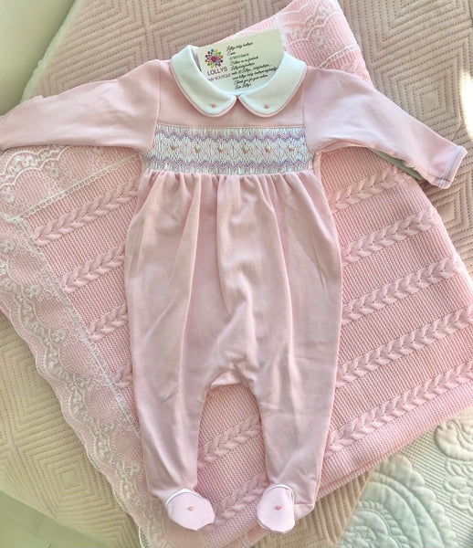Baby girls new season magnolia smocked babygrow scratch mitts on sleeve