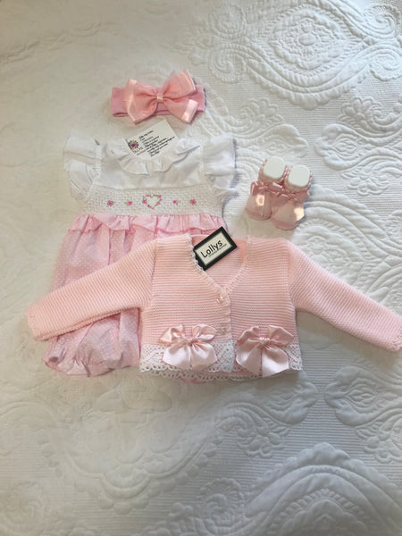 Collared frilled cap sleeved smocked heart romper white and pink with white spot