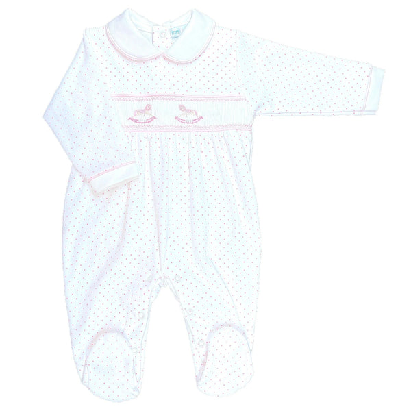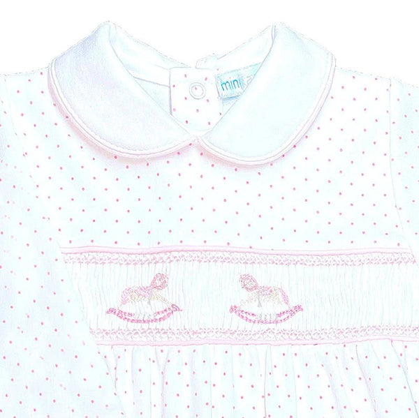 Pima cotton . White with pink dot . Smocked with rocking horses . By mini la mode.
