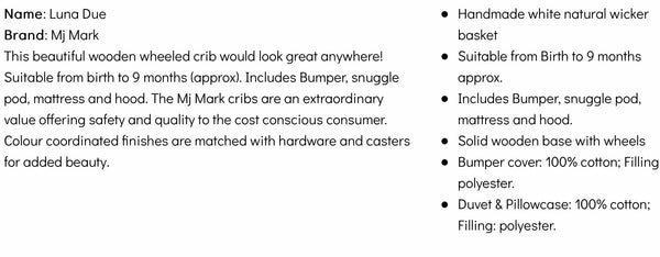 Luna due . White basket pink snuggle pod bumper mattress and hood cot