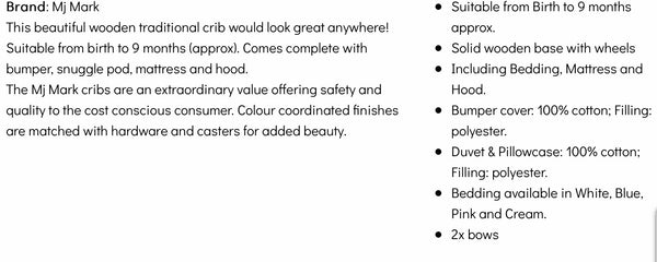 Luna uno Cream snuggle pod bumper hood & mattress Cot