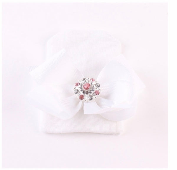 Soft hats for newborn. Baby girls. White . With large white bow and pink ribbon .