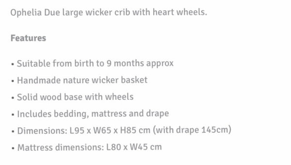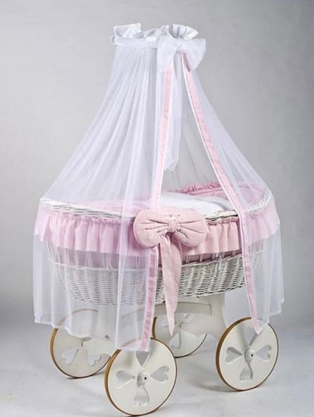 Large white wicker basket . Blue bedding . Heart wheels . Cot