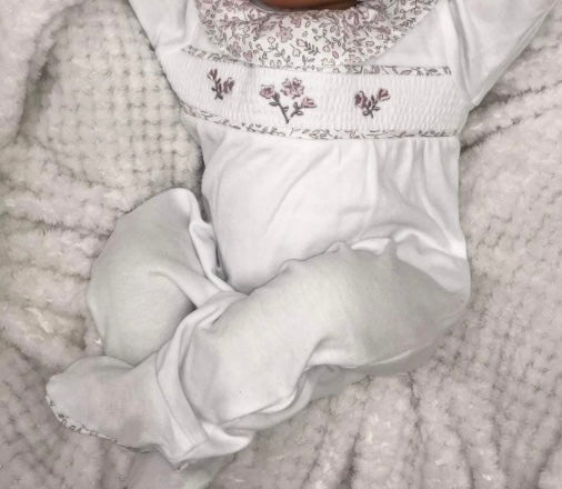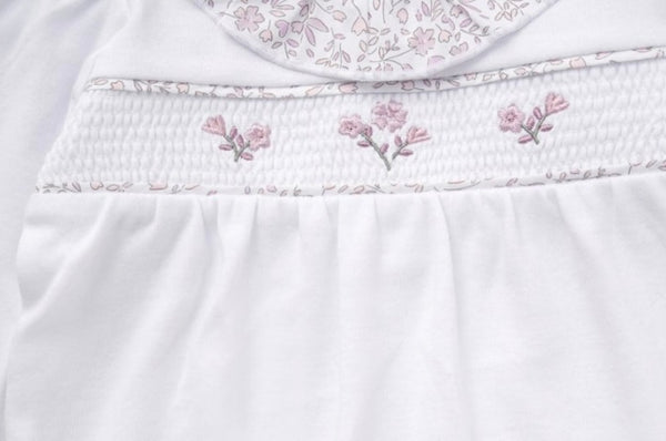 Baby girls floral collar white body and smocking babygrow