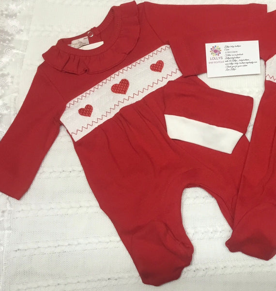 Red star smocked babygrow and hat